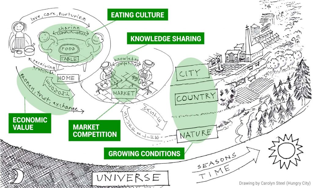 Each with a distinct scope of research, these prototypes can be viewed collectively to address five key themes in a drawing of Carolyn Steel’s book Hungry Cities, an important resource in the discussion of the state of the food system. These themes are respectively Eating Culture, Growing Conditions, Knowledge Sharing, Economic Value and Market Competition.
