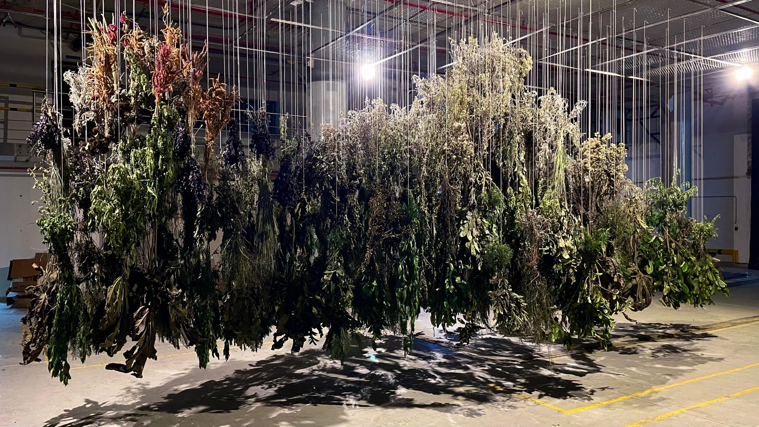traditionally regarded as medicinal or sacred. These plants are sourced from surplus circulation in Bogotá’s Samper Mendoza market, situating the work within living networks of urban trade, agricultural labour and ecological knowledge rather than within institutional collections.